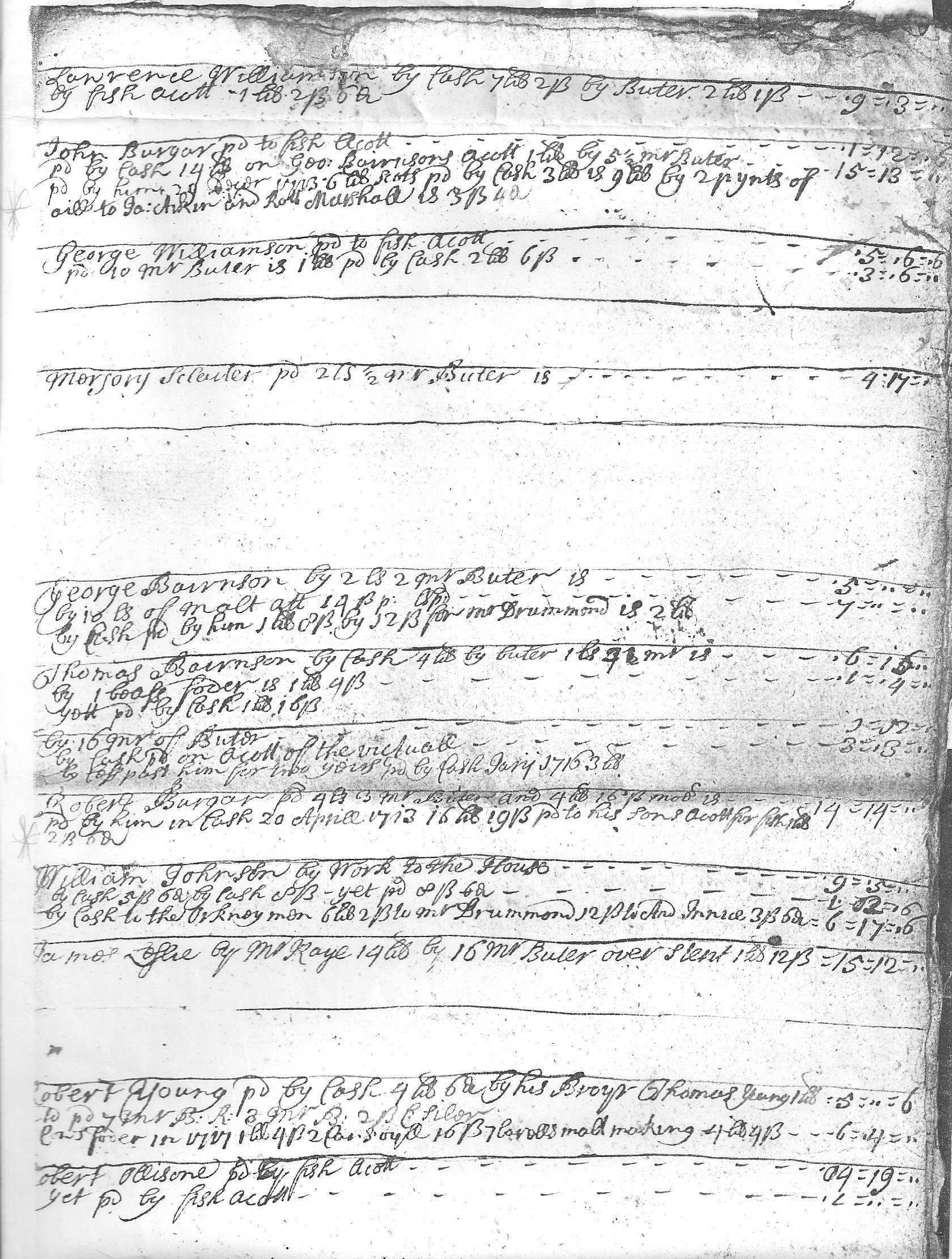 The accounts below are very difficult to understand, since they seem to include the rent that was being charged for croft and boat hire, as well as payment for the same. This included selling butter, meal, fish, oil etcetera. Because of the system of 'debt-bondage' the tenant was often owing money but sometimes was in credit.