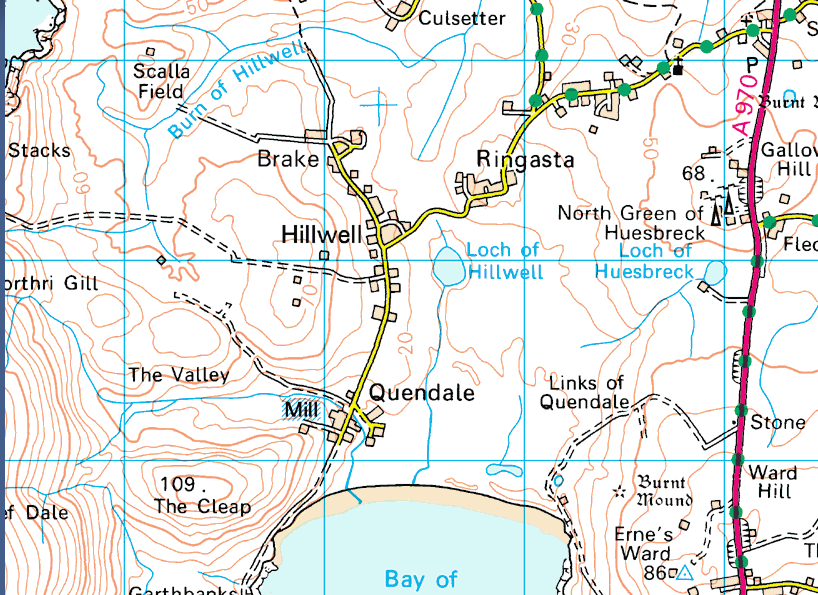 Hillwell and Brake of Hillwell are shown north of Quendale. The Sinclair family, Lairds of this area, lived at Quendale until 1760 when they became bankrupt.