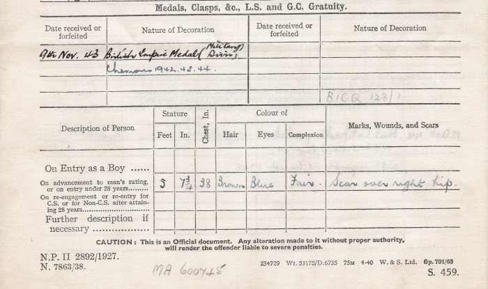 The details are shown in the attached Royal Navy forms. Only the parts of the forms with information on are shown.