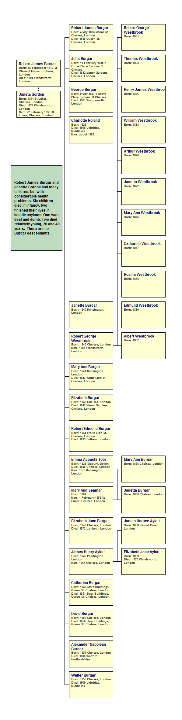 Tree showing the descendants of Robert James Burgar and Janetta Gordon
